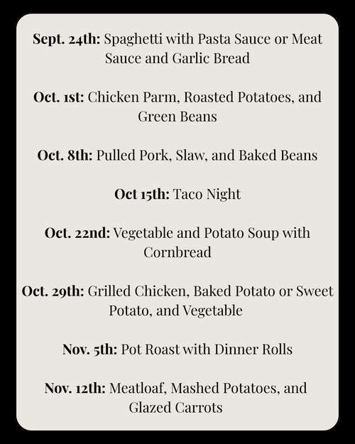 The cost is only $5 per person or $20 per family. Stay after for fellowship! Below, you will find the weekly menu. If you have any dietary restrictions (gluten free, allergies, vegetarian, etc.), please let us know in advance and we will arrange an alternative option. We want everyone to be able to enjoy dinner together!